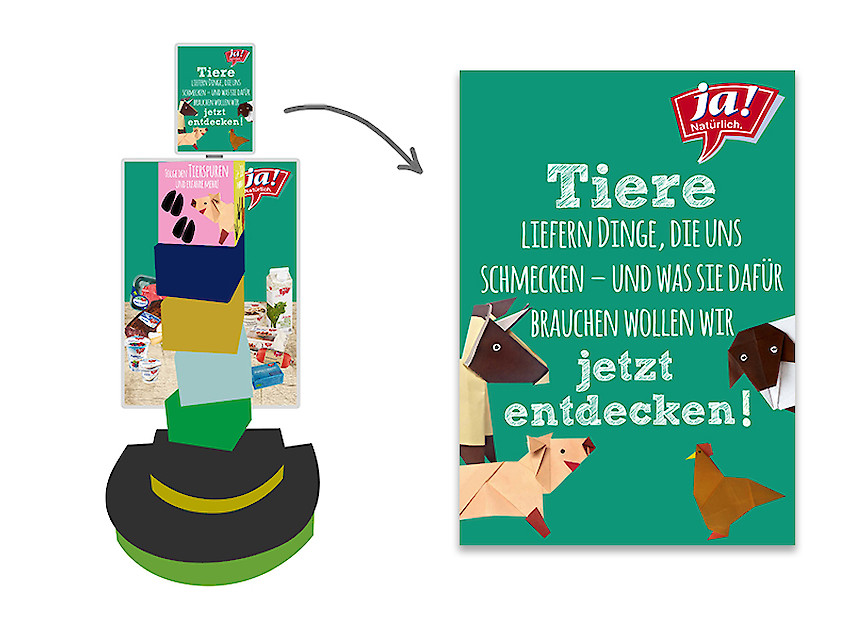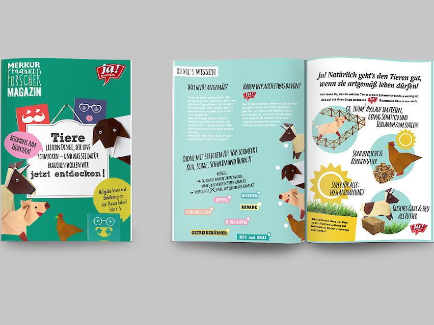 Kreatives Umsetzungskonzept (Idee/Text & Grafik) zum Thema artgerechte Tierhaltung für eine temporäre Präsenz der Marke Ja! Natürlich im Rahmen der Marktforscher/innen-Plattform in MERKUR-Märkten (Zielgruppe Kinder)